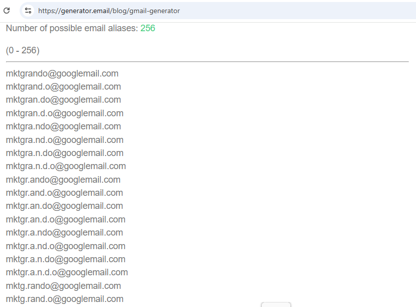 Suffice it to say that you need an valid, established account for this convenience to function for you. Let’s just presuppose that an account by the name of MktgRando@googlemail.com is registered to you. Deposit of the aforementioned email (minus the @gmail part) then needs injection into the form input over at the site https://generator.email/blog/gmail-generator to create a marketing wilderness-safe address. notice that you're given the choice to employ either the GMail Dot Trick (" . ") or Plus Trick (" + ") - OR BOTH.
